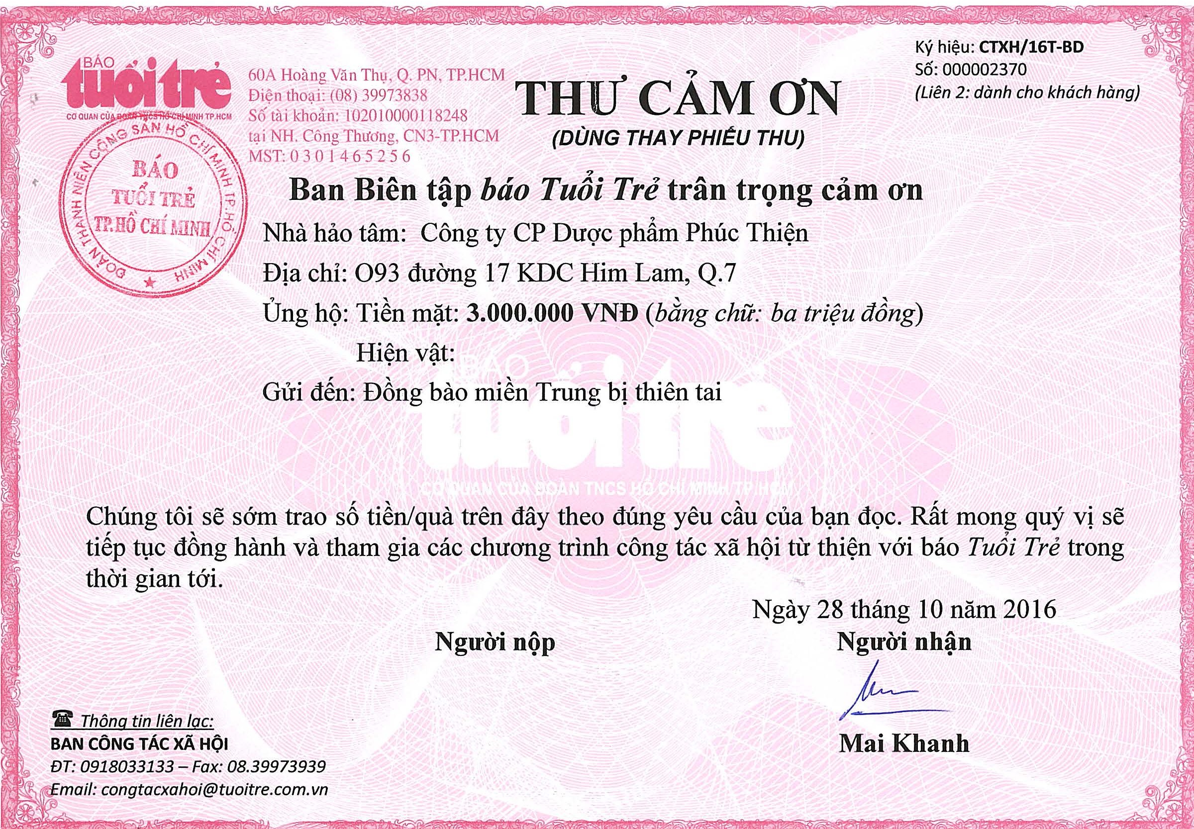 Thư cảm ơn (Báo Tuổi Trẻ) – Hỗ trợ miền Trung bị thiên tai